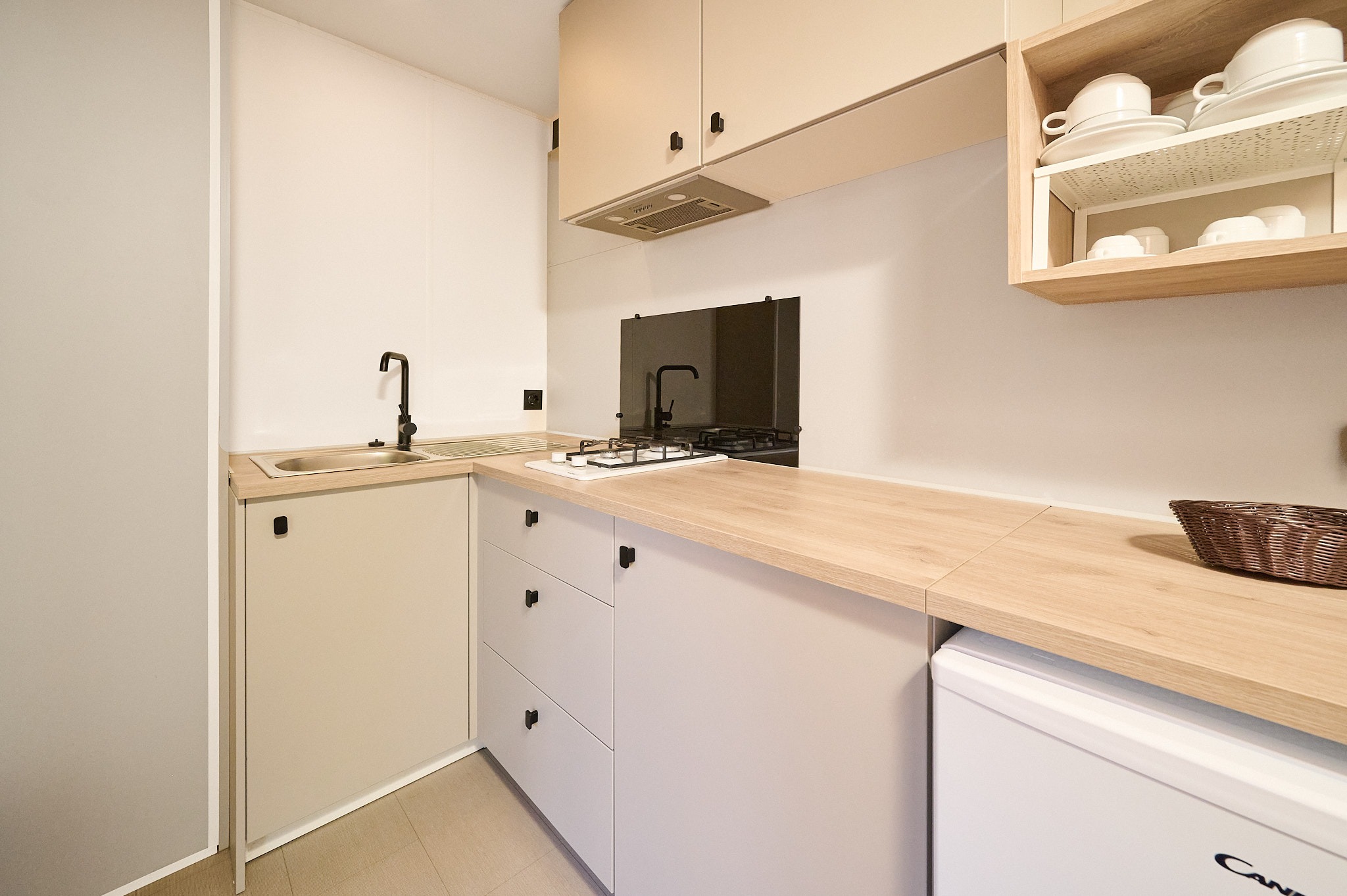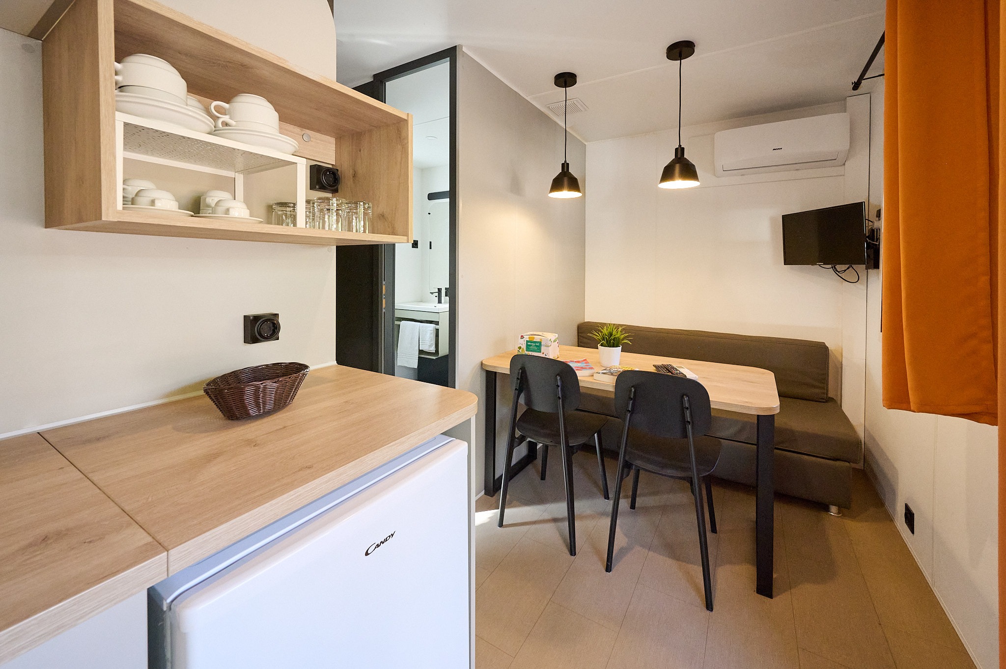All’esterno, il patio arredato diventa un perfetto prolungamento dello spazio interno — il luogo ideale per colazioni all’aperto, momenti di lettura o semplicemente per godere della tranquillità del campeggio immerso nella natura.