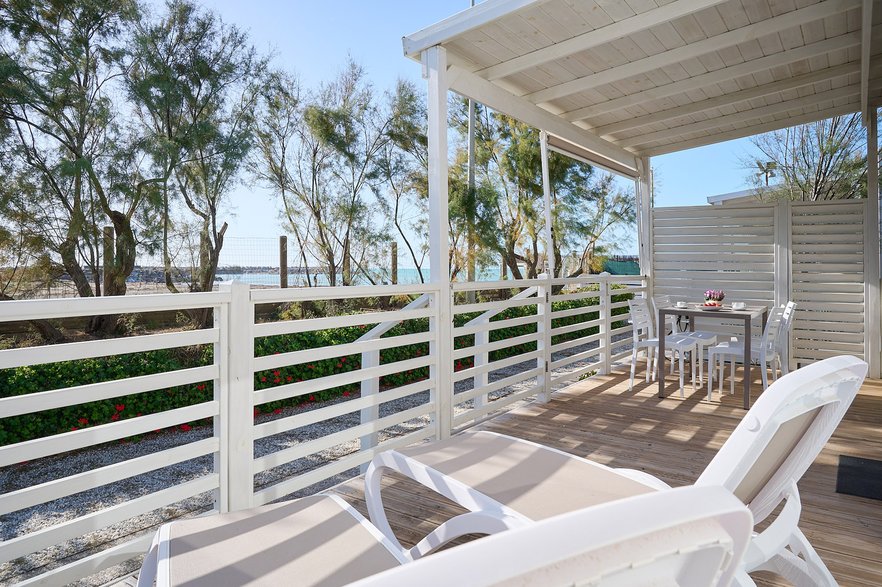 The spacious 14-m² seafront veranda, furnished with sun loungers, table and chairs, is an invitation to relax: the ideal place for sea-view breakfasts, sunset dinners and moments of pure outdoor well-being.