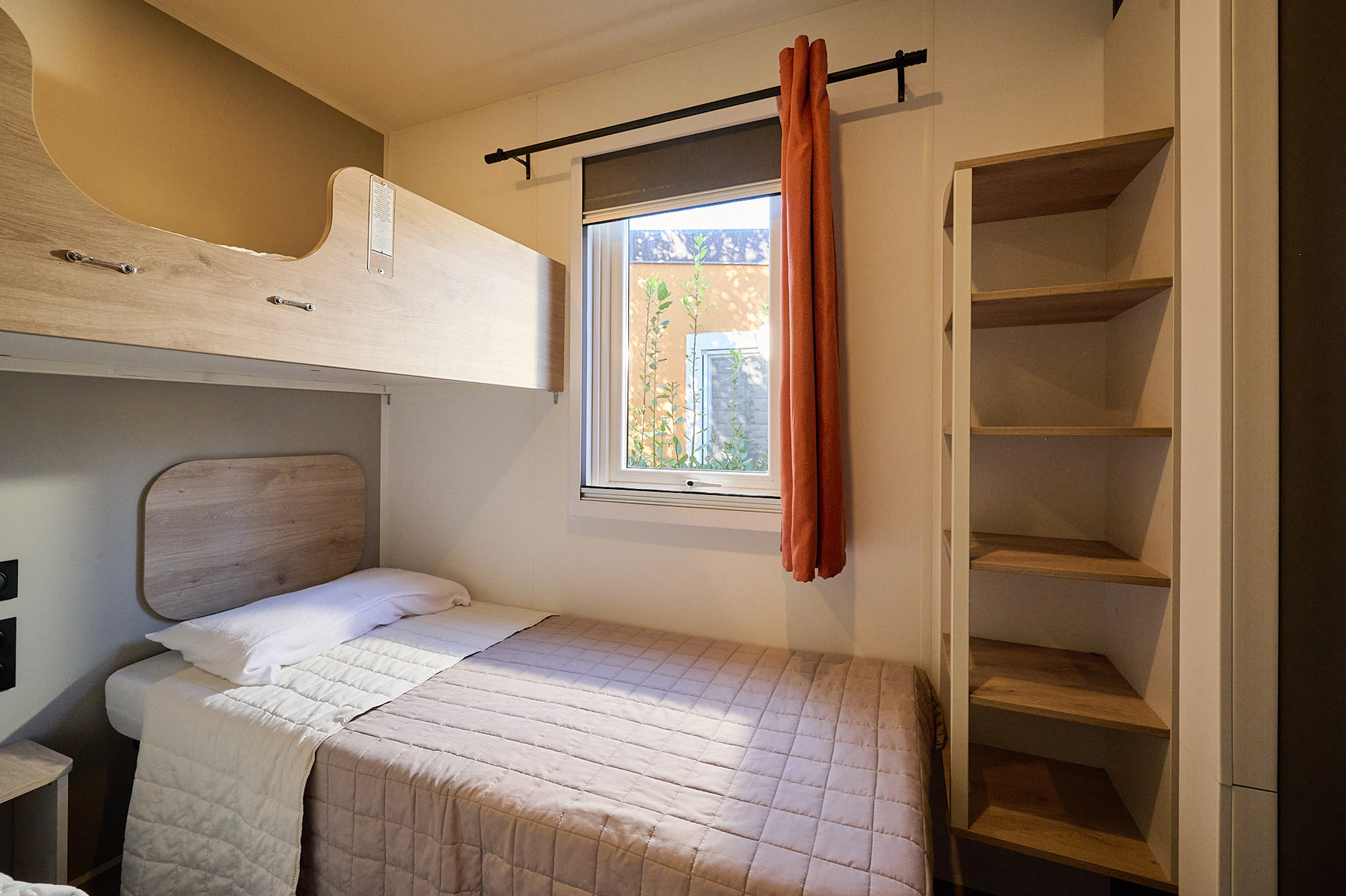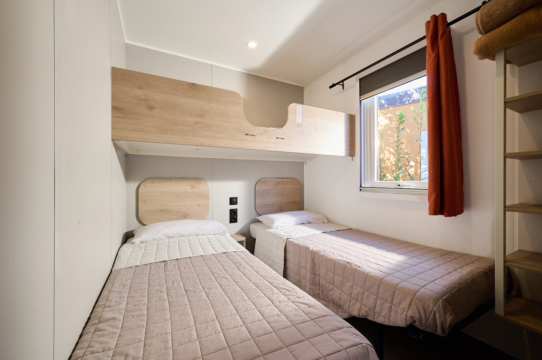 The mobile home has a cozy double bedroom and a second bedroom with three single beds, one of which is a flag bed, perfect for accommodating children or friends.